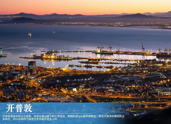 【開普敦】是歐裔白人在南非建立的第一座城市,這座南非白人心中的母城三百余年來數(shù)度易主,歷經(jīng)荷、英、德、法等歐洲諸國(guó)的統(tǒng)治及殖民,雖然地處非洲,但卻充滿多元?dú)W洲殖民地文化色彩。開普敦集歐洲和非洲人文、自然景觀特色于一身,因此名列世界最美麗的都市之一,也是南非最受歡迎的觀光都市。