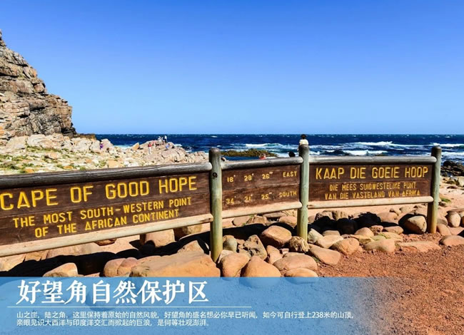 【好望角】于開普半島南端,在保護(hù)區(qū)內(nèi),鐵銹色凹凸不平的地面上生長(zhǎng)著一片片低矮的灌木叢和被稱為南非國(guó)花的山龍眼,狒狒、非洲旋角大羚羊等動(dòng)物間或在眼前一躍而過。在大西洋邊紅色的卵石灘上,時(shí)??梢婑匄B閑庭信步的可愛模樣。在保護(hù)區(qū)的西南端有一個(gè)如同伸入大西洋中巨大鱷魚爪的岬角。