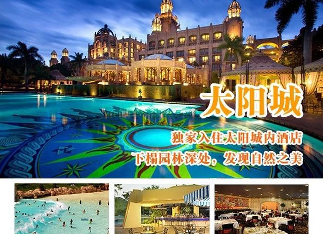 酒店早餐。前往機場,搭乘航班飛往約堡。驅車前往南半球最大的娛樂中心-太陽城。不曾身臨其境,便無法真正理解太陽城給人所帶來的震撼。將古老傳說的神秘滄桑、非洲大陸的野性粗獷和現(xiàn)代生活的便利舒適那樣完美地融合在一起。你可以在失落城探尋非洲大陸上最古老的秘密,根據(jù)神話傳說興建的地震橋以及豪華賭場、著名的建筑-失落城等。這里有清幽的湖光山色,無數(shù)的珍禽異草,游人可漫步其中享受。(含自由活動游覽時間約3小時) 晚餐后,入住太陽城內豪華酒店,您可于太陽城內賭場大顯身手。溫馨提示:約堡-太陽城,約210公里,車程約3小時