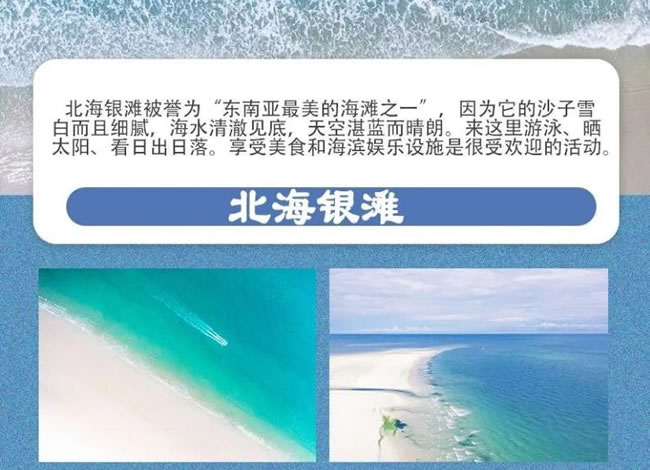 北海銀灘被譽為“東南亞最美的海灘之一 ”因為它的沙子雪白而且細(xì)膩,海水清 澈見底,天空湛藍(lán)而晴朗。來這里游泳、曬太陽、看日出日落。享受美食和海濱 娛樂設(shè)施是很受歡迎的活動