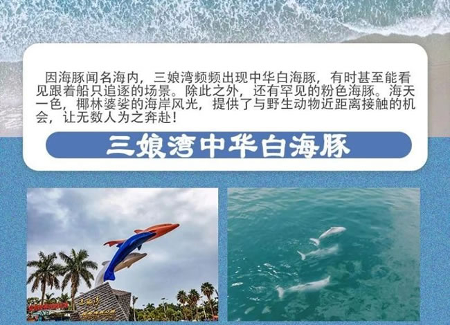 因海豚聞名海內(nèi),三娘灣頻頻出現(xiàn)中華白海豚,有時甚至能看見跟著船只追逐的 場景。除此之外,還有罕見的粉色海豚。海天椰林婆娑的海岸風(fēng)光,提供了與野 生動物近距離接觸的機(jī) ·備讓無數(shù)人為之奔赴!