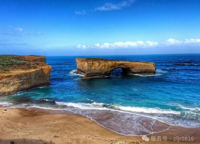 【倫敦?cái)鄻颉繌那斑@個(gè)巖石是突出海面與陸地連接的岬,由于海浪的侵蝕沖刷形成 2 個(gè)圓洞,正好成雙拱形,所以 起名為“倫敦橋”。在 1990 年 1 月 15 日的傍晚時(shí)分,與陸地連接的圓洞突然塌落,與大陸脫離形成的斷橋。大自 然的力量是巨大的,大自然塑造的景觀有一種人工無(wú)法比擬的神奇。