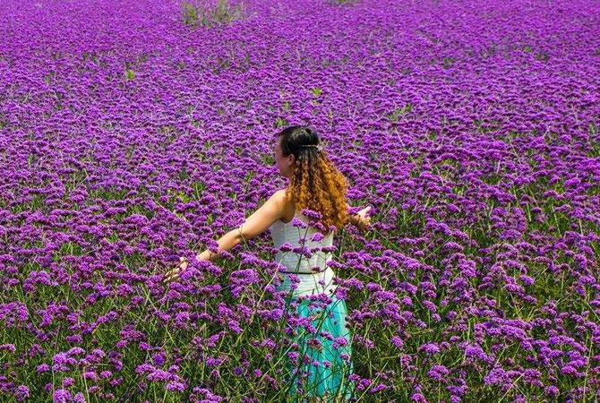 馬鞭花景區(qū),近百畝馬鞭草花田里,鮮花盛開。遠遠望去,如同為綠色大地鋪上一層紫色的地毯。微風(fēng)拂動下,紫色的馬鞭草愈發(fā)動人,吸引了不少游客前來拍照留影。